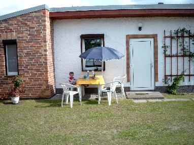 Vor dem Ferienhaus erstreckt sich nach Nordwesten eine ca. 8-12 m breite und 30 m lange Wiese. An dessen Ende steht Ihnen eine 3x3 m große Sitz- / Grillfläche mit Gartenmöbeln und Grill zur Verfügung. Diese Fläche ist mit einem Partyzelt überdacht und hat einen Stromanschluß. Neben der Sitzfläche steht unser Holzbackofen, in dem wir regelmäßig Brot und Kuchen backen.