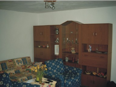 Im Wohnraum stehen die Küchenzeile, Eßtisch, Schrankwand, Klappcouch mit zwei Sessel und ein Couchtisch.